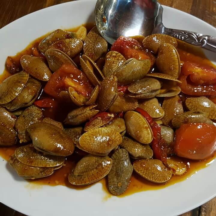 Kerang laut dimasak dengan asin bawang khas Raja Ikan Warung Seafood.